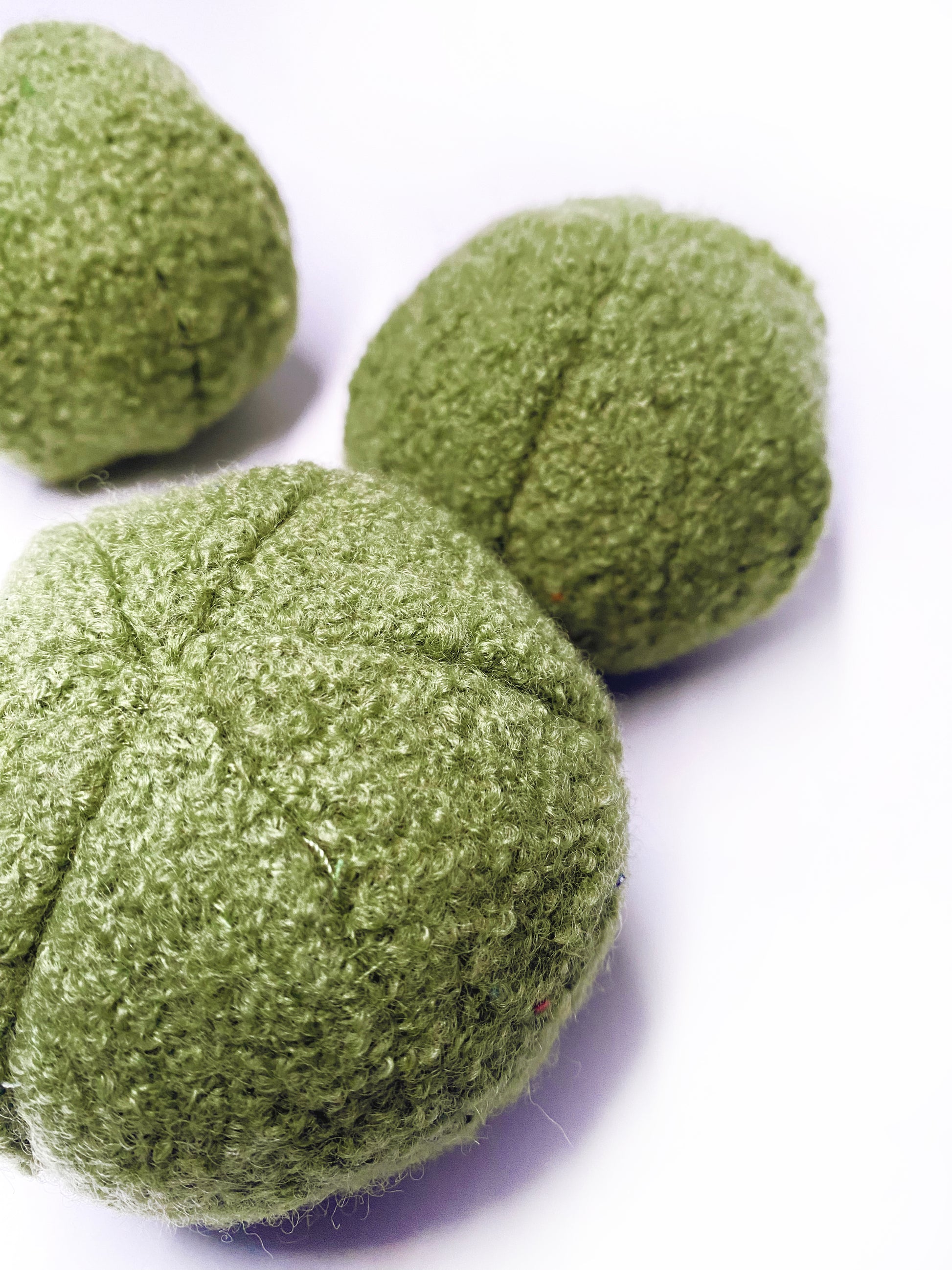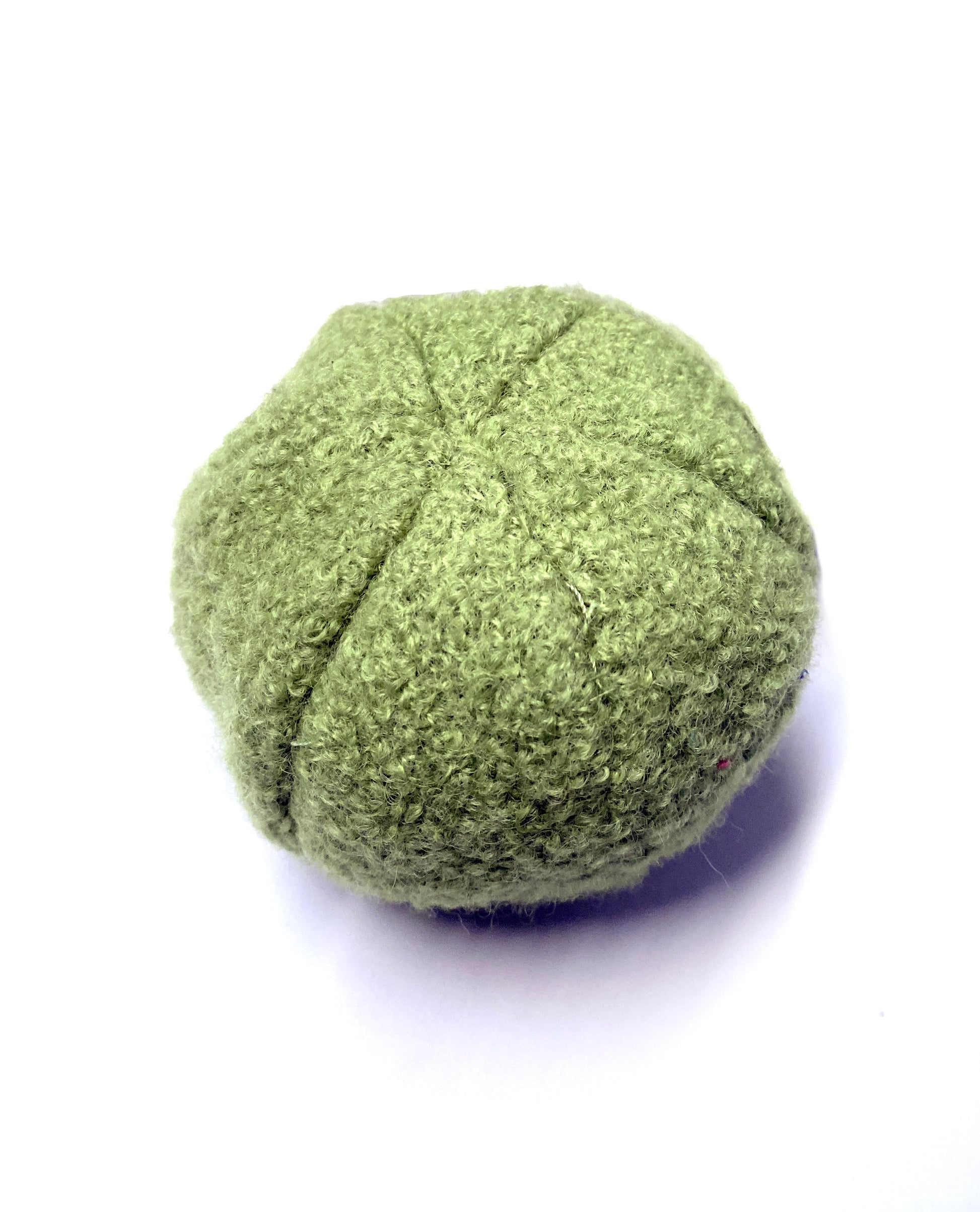 Zrobiona i wypełniona materiałami z drugiego obiegu. Wewnątrz skrawki różnych materiałów.