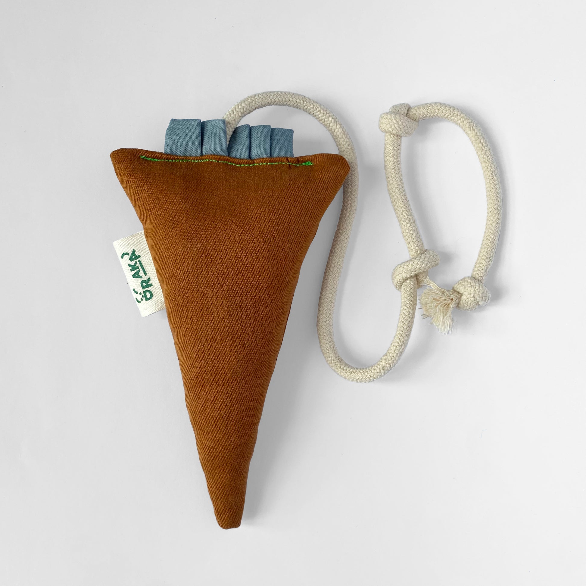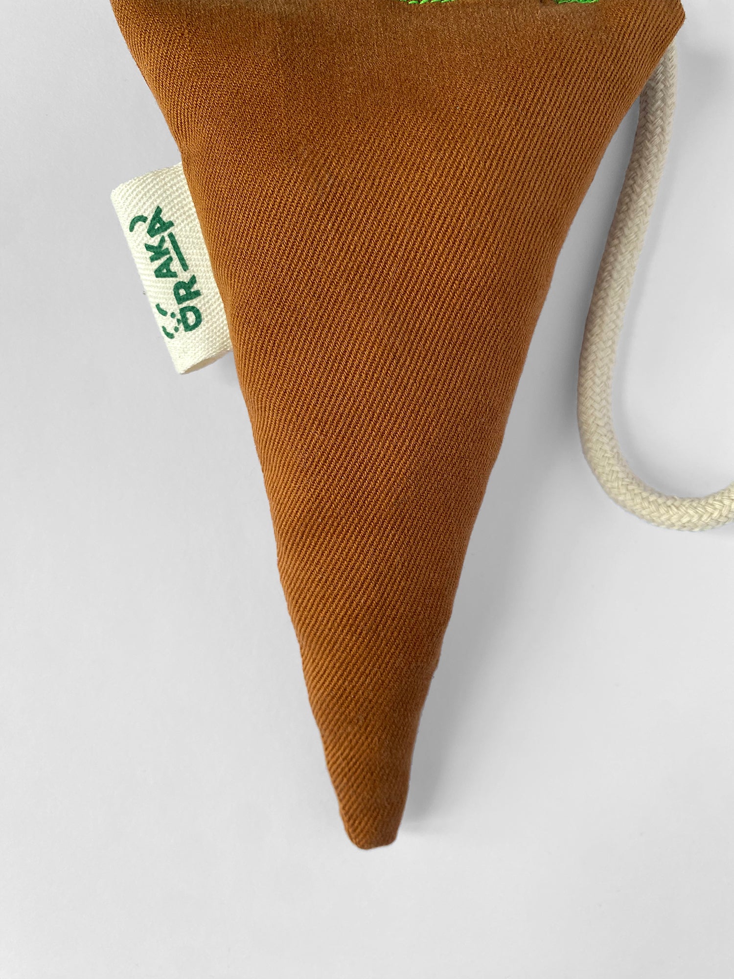 Zrobiona i wypełniona materiałami z drugiego obiegu. Wewnątrz skrawki różnych materiałów. Sznurek bawełniany.