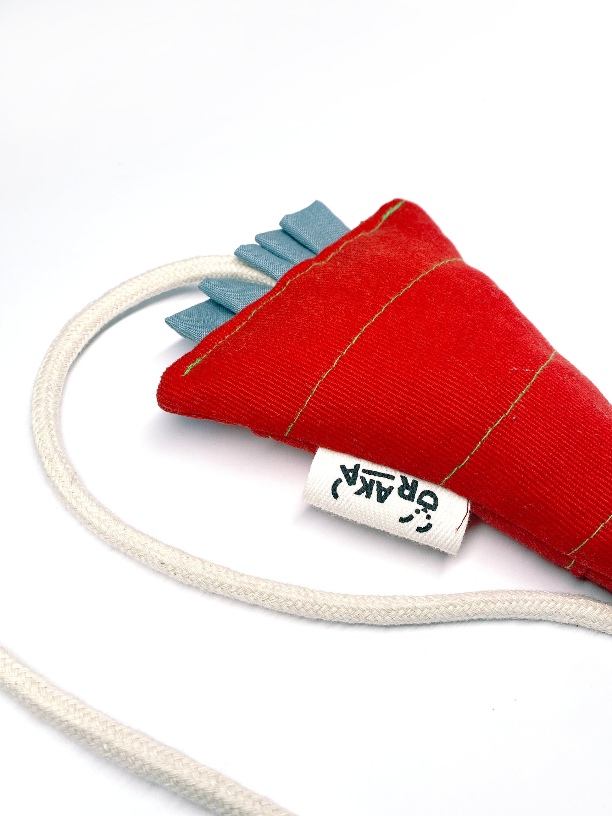 Zrobiona i wypełniona materiałami z drugiego obiegu. Wewnątrz skrawki różnych materiałów. Sznurek bawełniany.